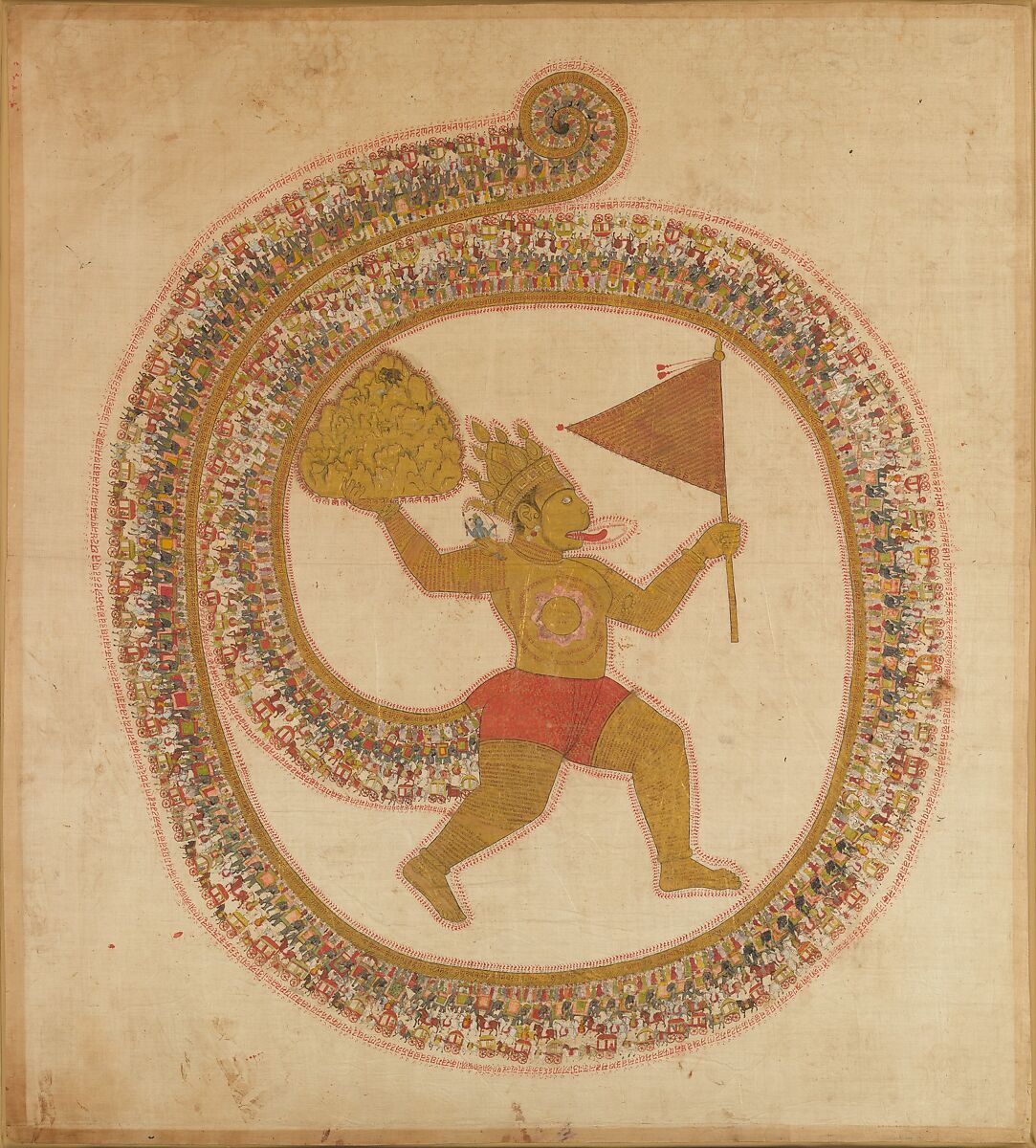 This piece is called Hanuman Bearing the Mountain with Medicinal Herbs, with no specific artist credited, painted in India around 1800. This image is a devotional for Hanuman, and one of his many heroic and Godly acts. In Indian culture, Hanuman is a God, who commands a monkey army and commits many acts of bravery and valor.